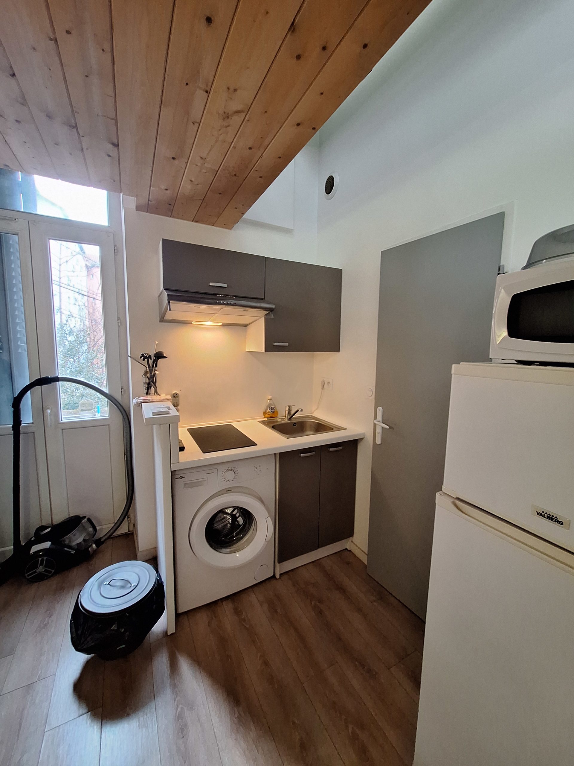 Rue des Bienvenus. Apparement meublé sur cours intérieure au 1er étage sans ascenseur avec balcon. Il se compose d’une pièce de vie entièrement meublée et équipée, un espace nuit en mezzanine, une salle d’eau avec douche et toilettes non séparés. Chauffage individuel électrique. Tous les abonnements sont individuels. Libre de suite. Référence : 3163