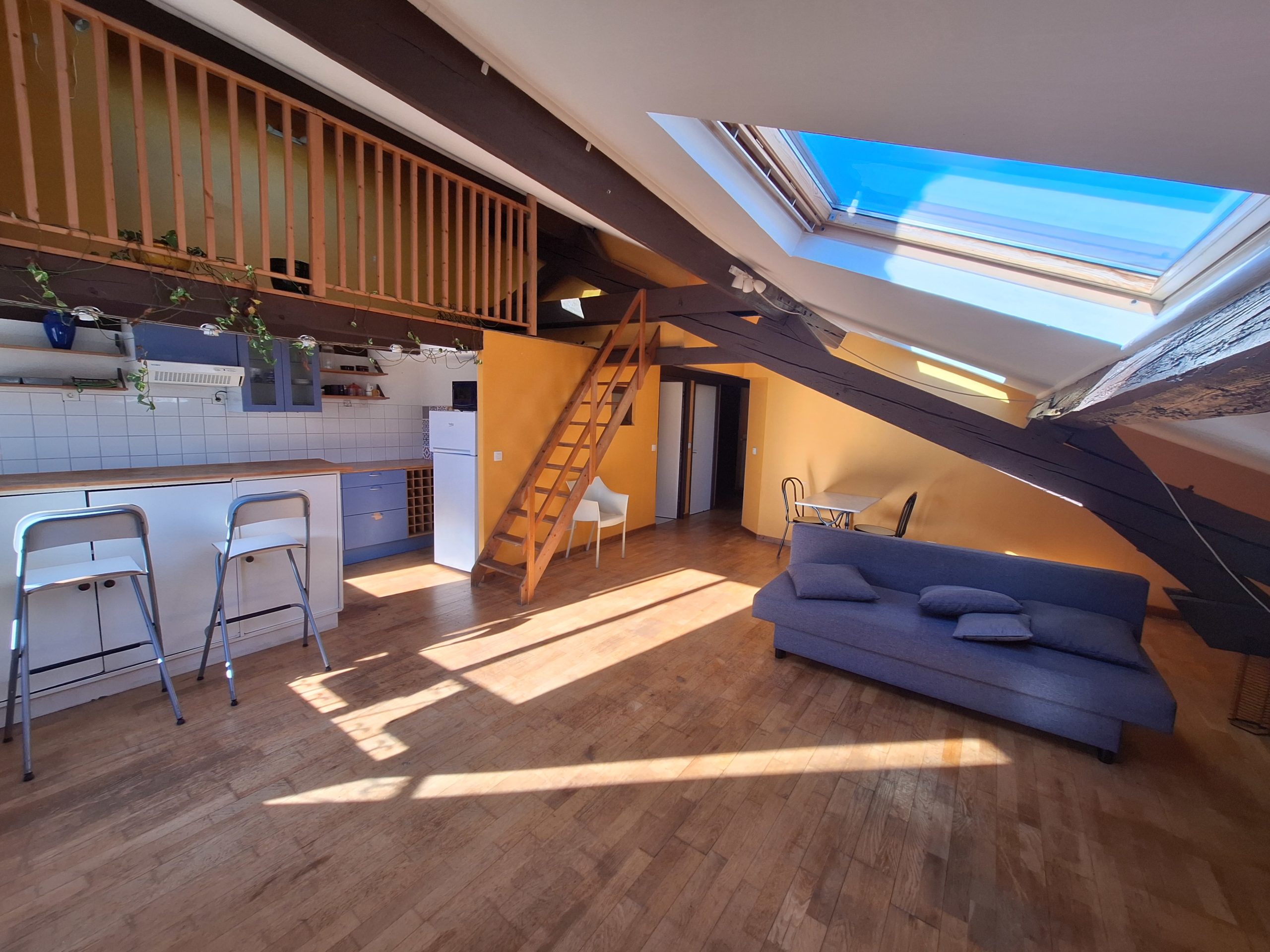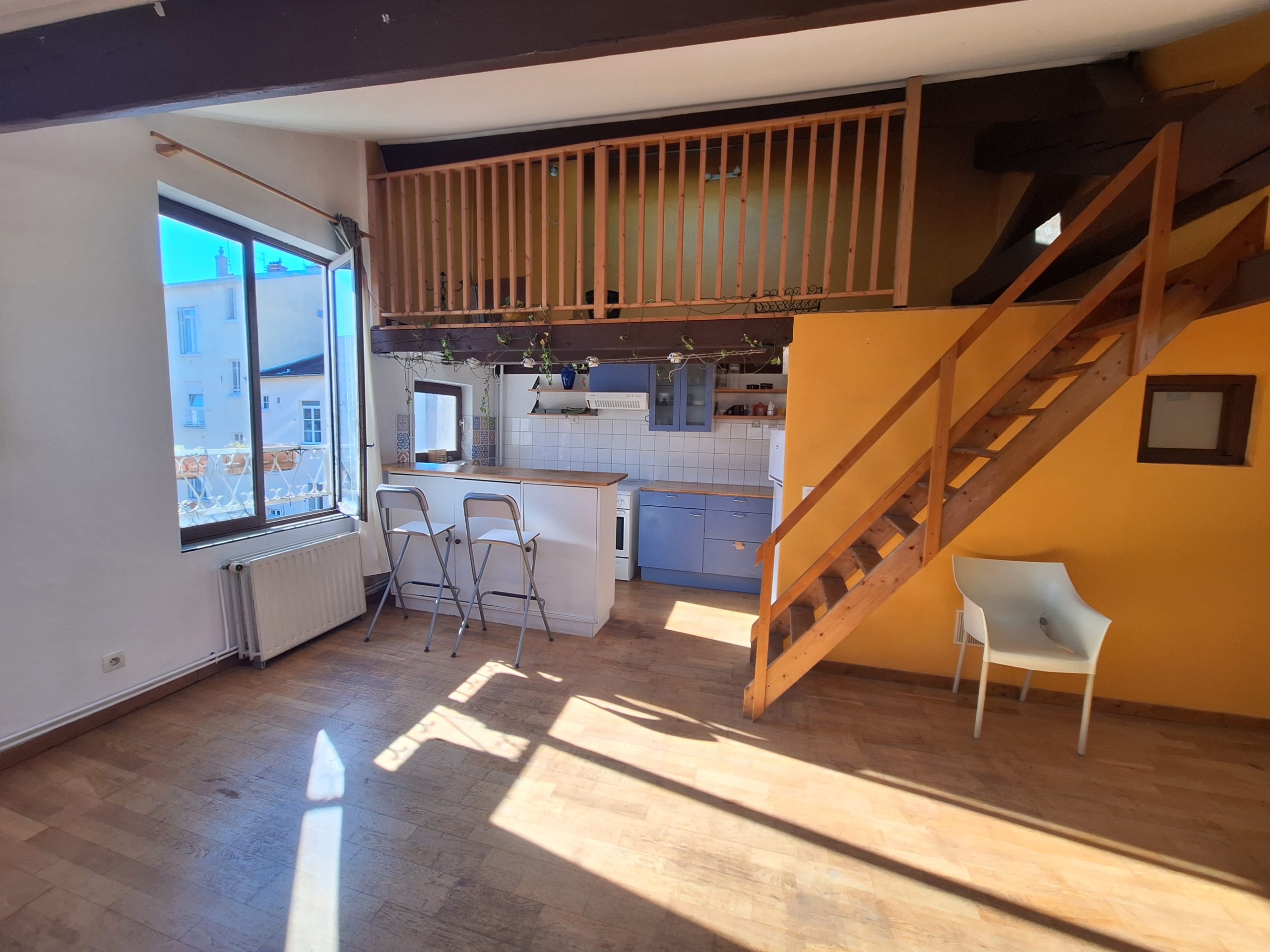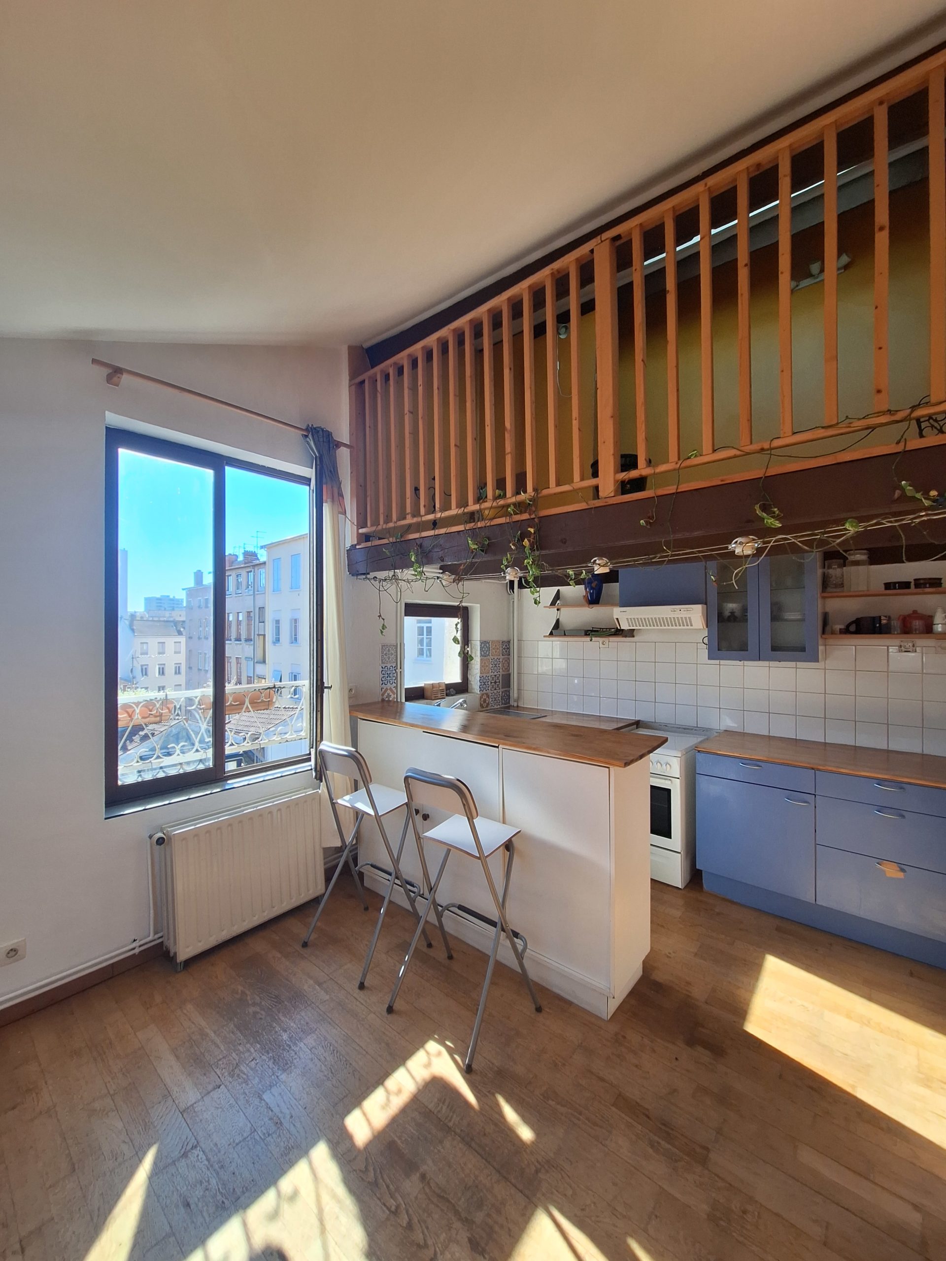 Situé entre le Métro Hénon et le Métro Croix Rousse. Dans un immeuble ancien, au 4ème et dernier étage sans ascenseur. Appartement de 50,76m2 (+ 37,31m2 de surface non prise en compte car inférieure a 1m80). Il se compose d’une entrée avec un premier escalier en colimaçon menant a la première mezzanine, une piece de vie avec cuisine américaine meublée et équipée, une chambre avec rangements, un second espace en mezzanine au dessus de la cuisine, une salle de bains avec baignoire et toilettes séparés. Chauffage individuel au gaz. Tous les abonnements sont individuels. Libre de suite. Référence: 3133.